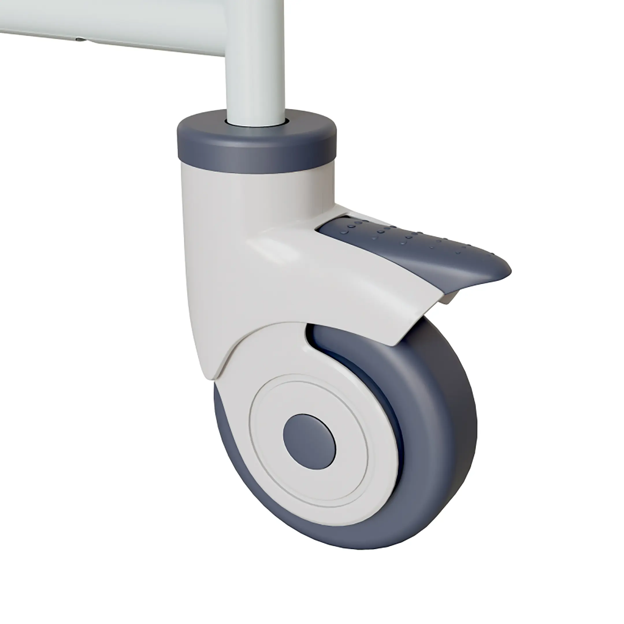 - колеса кровати поворотные, самоориентирующиеся, диаметром 100 мм, комплекующиеся надёжной стальной вилкой с прецизионным радиально-упорным подшипником, ободом из полипропилена и шинкой из серого полиуретана, не оставляющего следов на полу (два колеса – с индивидуальным тормозным устройством);