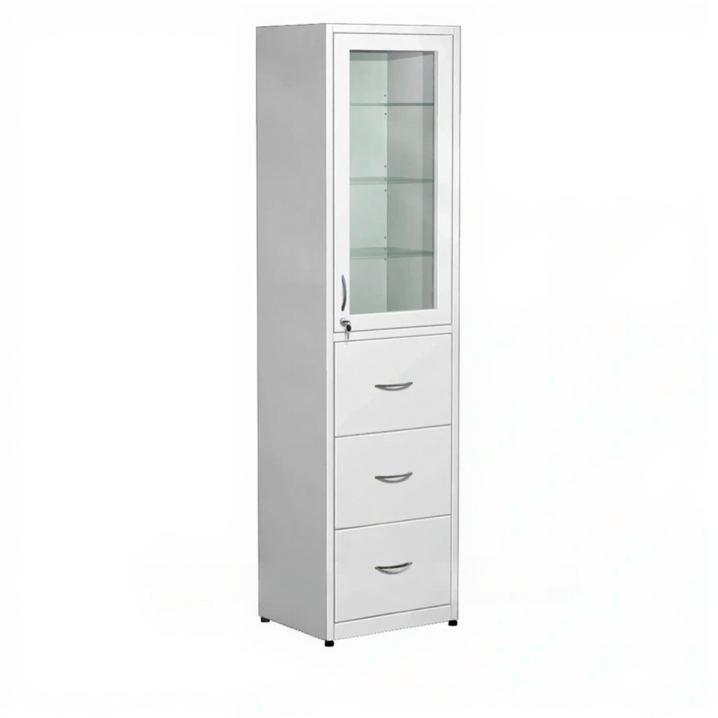 Шкаф для медикаментов, стекло в металлической рамке, с ящиками ШМп-3.1 (белый) активно используются в больницах, лабораториях, аптеках, где необходимо хранение медикаментов, медицинского инвентаря, одежды работников, приборов, больничной документации.