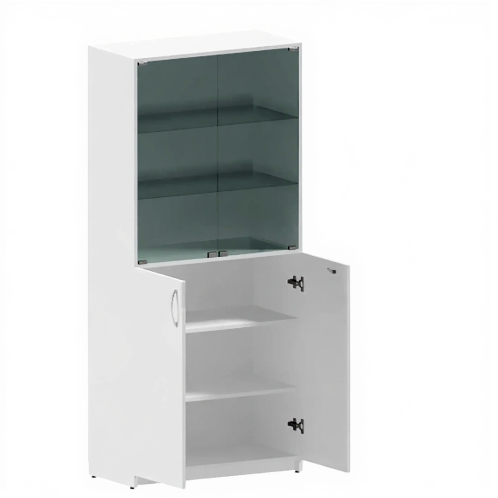 • 2 дверцы (нижние) из ЛДСП, 2 дверцы (верхние) из стекла, 2 полки (в нижней секции) из ЛДСП, 2 полки (в верхней секции) из стекла;
