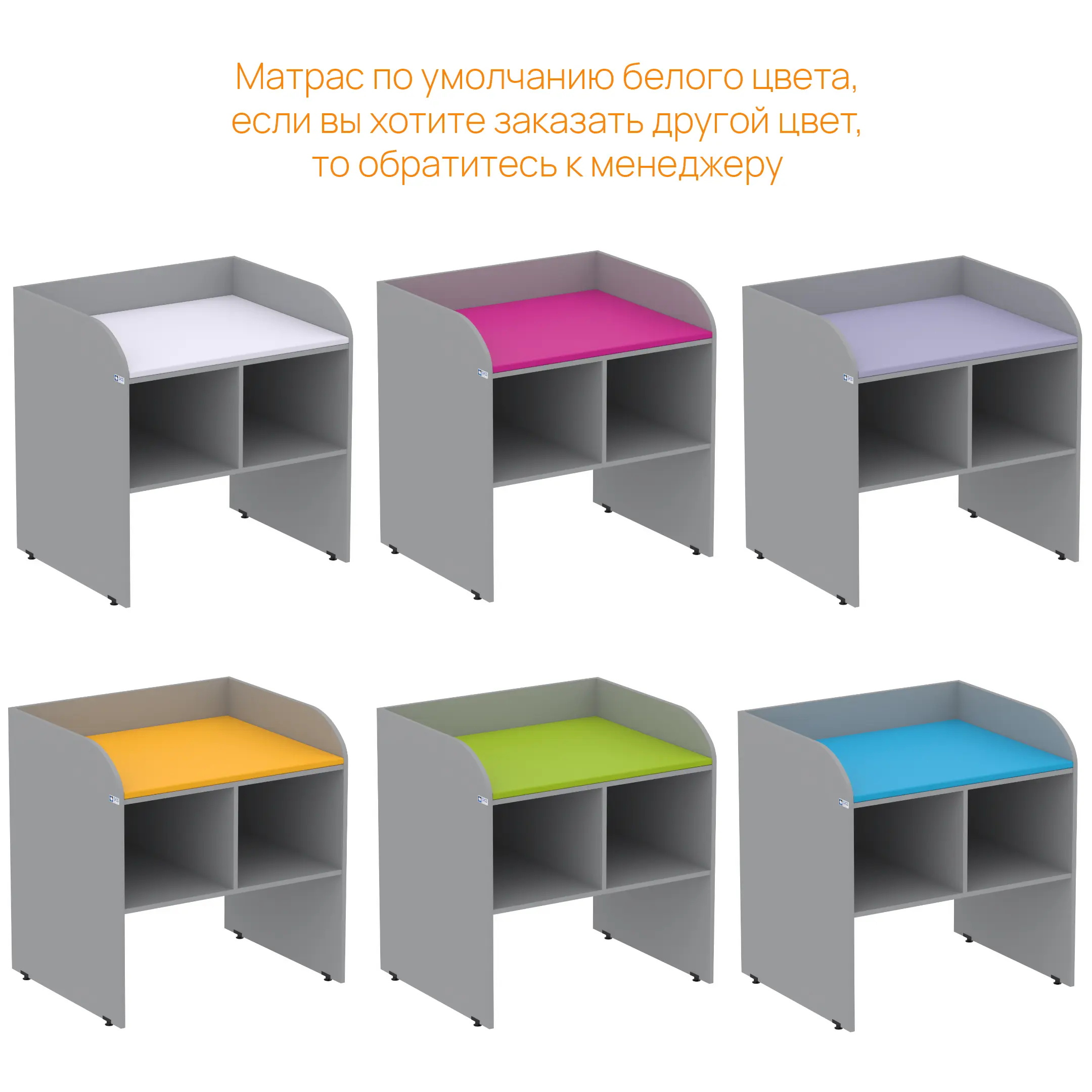 - Комплектация мягким матрасом — матрас белого цвета входит в стандартную комплектацию (по запросу доступны другие цвета: синий, сиреневый, лайм, оранжевый, розовый).