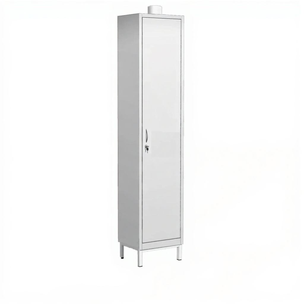 - Безопасное хранение — фланец для подключения к вытяжной вентиляции и вентиляционный канал обеспечивают удаление едких паров и защиту от их скопления.