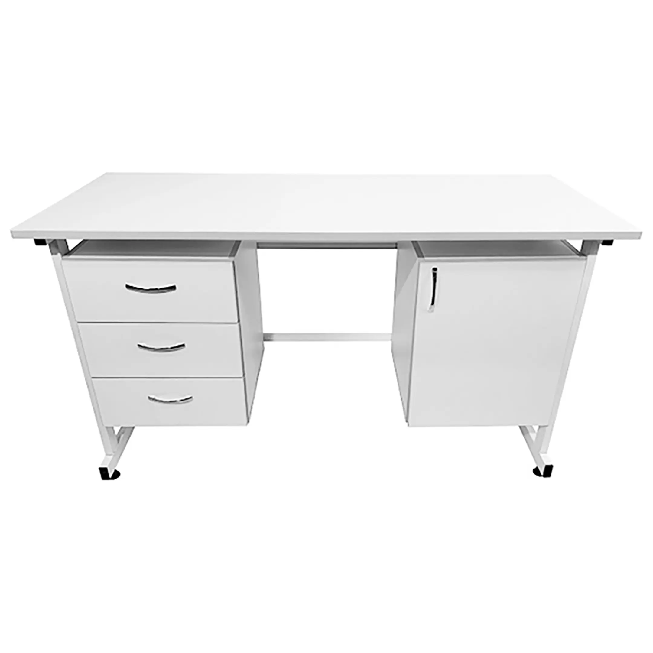 - Комбинированная система хранения — левая тумба с тремя выдвижными ящиками, правая тумба с распашной дверкой и полкой для удобного хранения материалов.