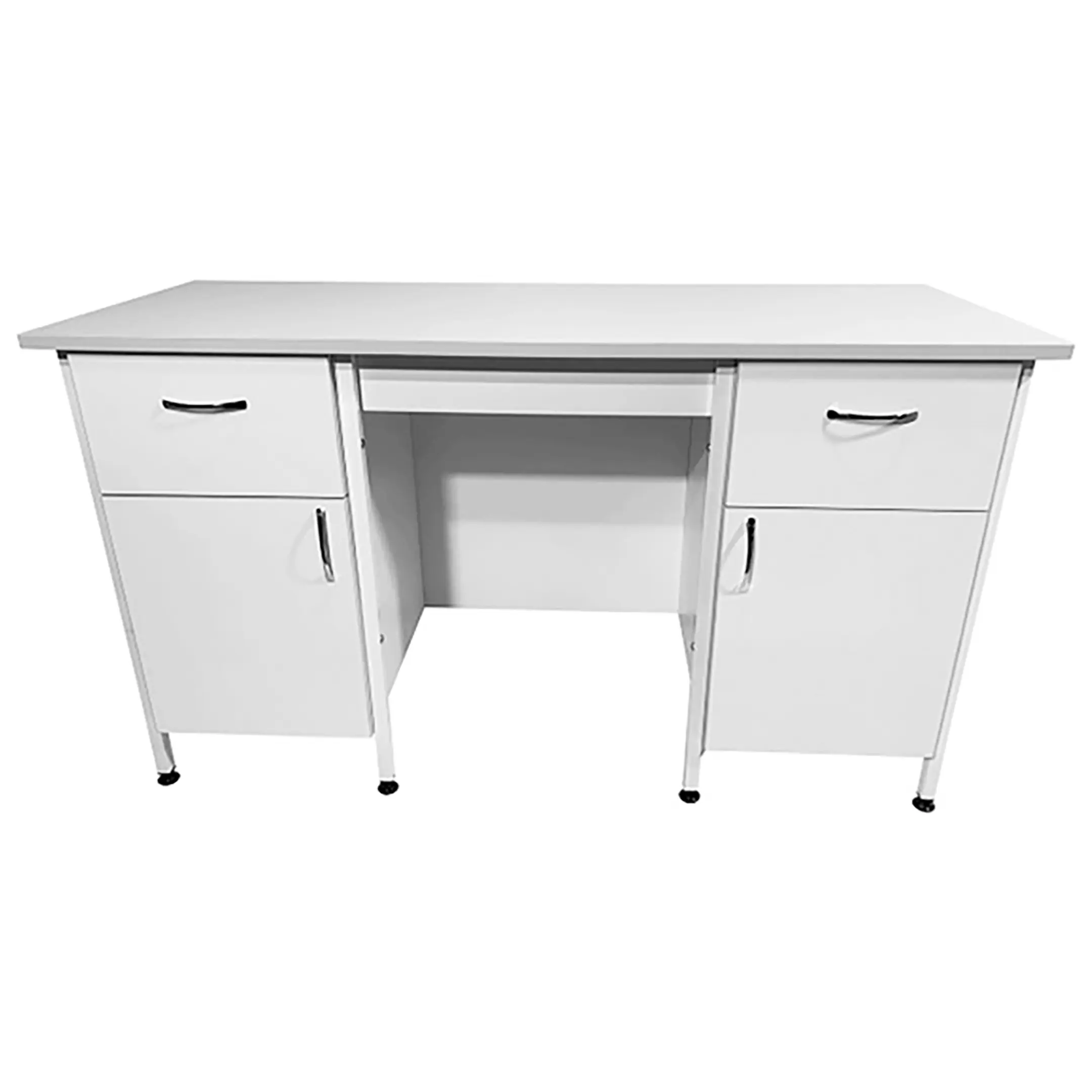 Стол лабораторный СЛ 12.017 (белый) — это функциональное и элегантное решение для создания эффективного рабочего пространства не только в лабораториях, но и в медицинских учреждениях. Модель оснащена двумя тумбами с выдвижными ящиками, полками и распашными дверками. Каркас выполнен из стального профиля, столешница из ЛДСП толщиной 22 мм.