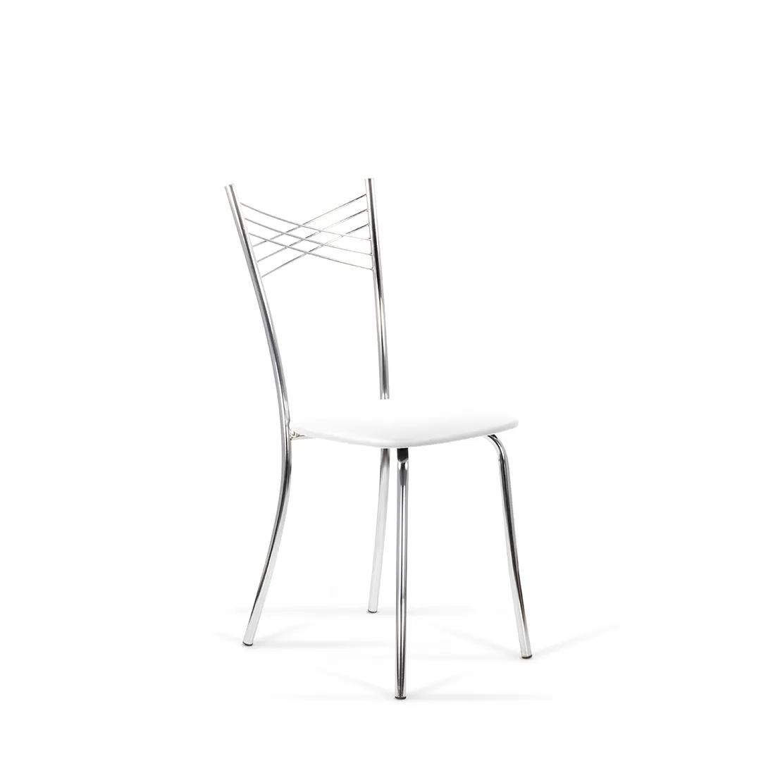 Воздушная модель стула имеет интересный дизайн спинки, представляющую собой крестообразное пресечение нескольких металлических нитей, образующих в центре маленькие ромбики. Каркас стула выполнен из хромированного металла