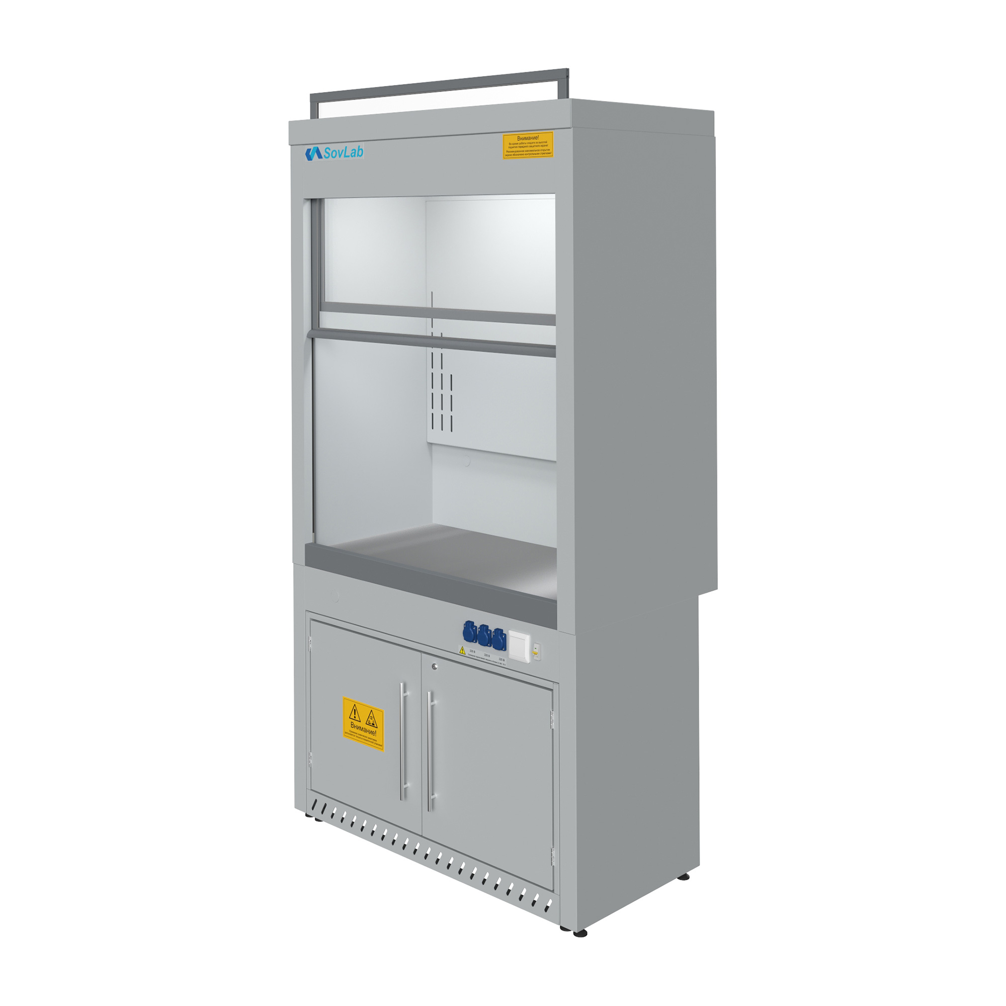 - Безопасная работа с летучими веществами — вертикально-подъемный защитный экран из ударопрочного стекла с системой противовесов для плавного хода и фиксации.