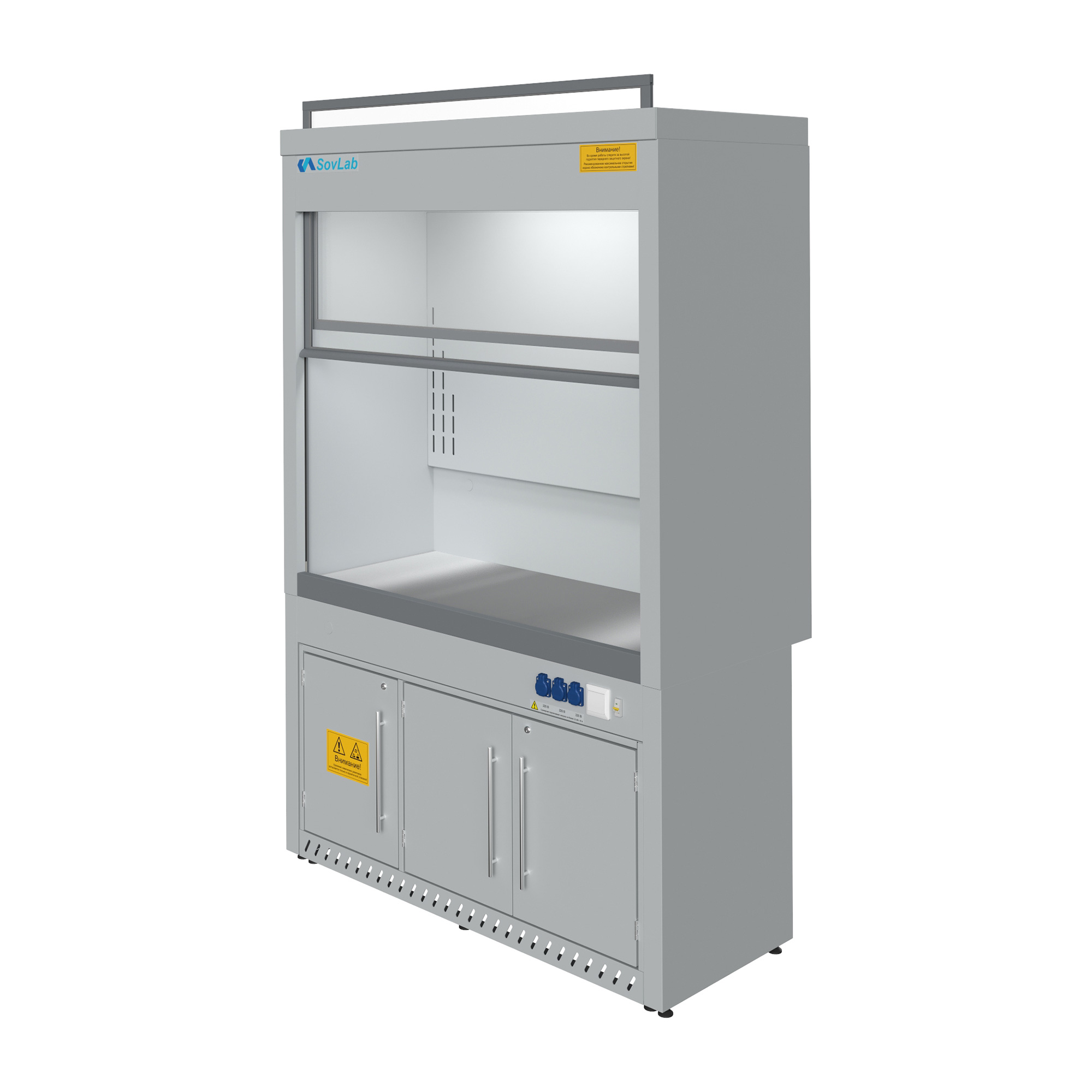 - Безопасная работа с летучими веществами — вертикально-подъемный защитный экран из ударопрочного стекла с системой противовесов для плавного хода и фиксации.