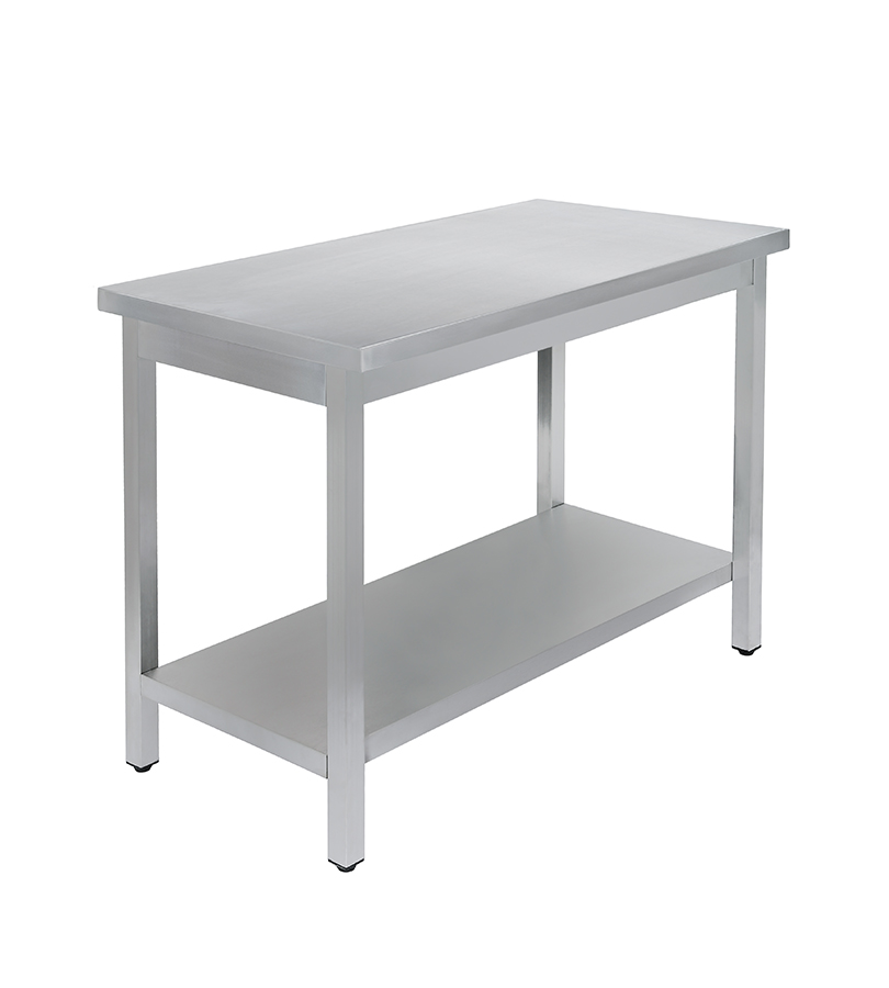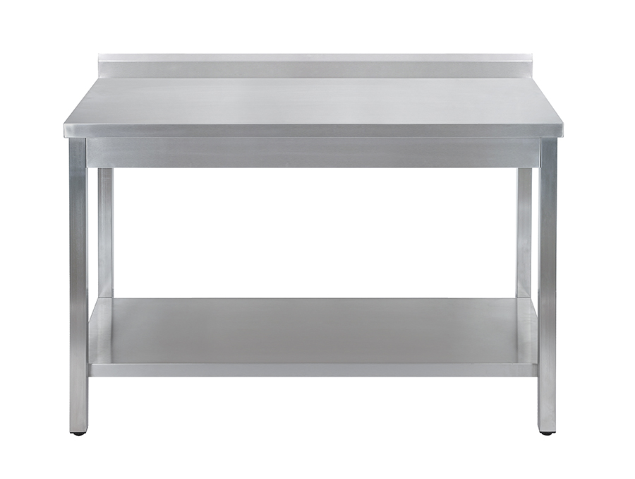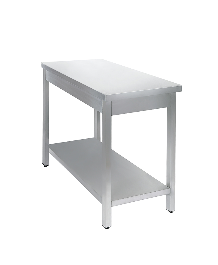 Главное преимущество этой модели стола — материал изготовления. Стол полностью сделан из нержавеющей стали: корпус, столешница, ножки. Выгодно дополнен сплошной полкой, где можно хранить габаритную утварь: котлы, противни, ведра, гастроемкости. Имеет съемный борт, благодаря чему возможно как пристенное, так и островное размещение стола в производственном помещении.