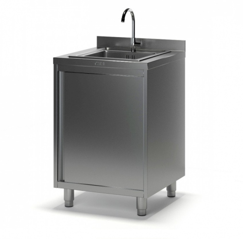 Ванна моечная из нержавеющей стали с тумбой: с бортом, задняя стенка - оцинкованная сталь, цельнотянутая ванна. Дверца распашная.