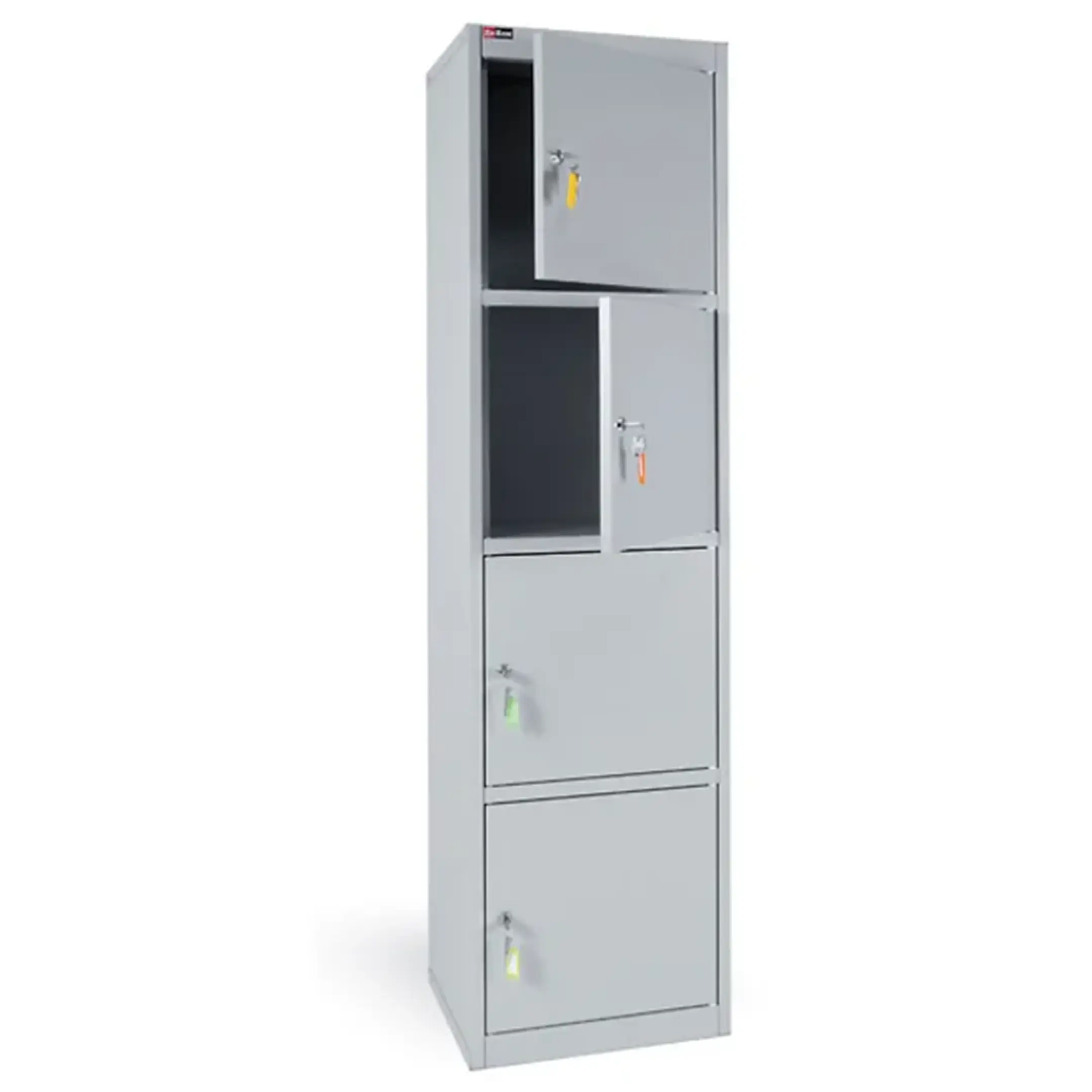- Прочная и надежная конструкция — шкаф изготовлен из качественной листовой стали с антикоррозийным порошковым покрытием, что обеспечивает долговечность, устойчивость к механическим воздействиям и защиту содержимого. Распашная дверца запирается на надежный встроенный замок с ключом.