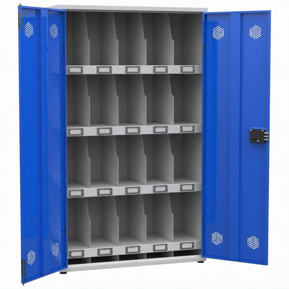 • Шкаф модульный усиленный для хранения 20 противогазов имеет индивидуальные ячейки для хранения с держателями этикеток.