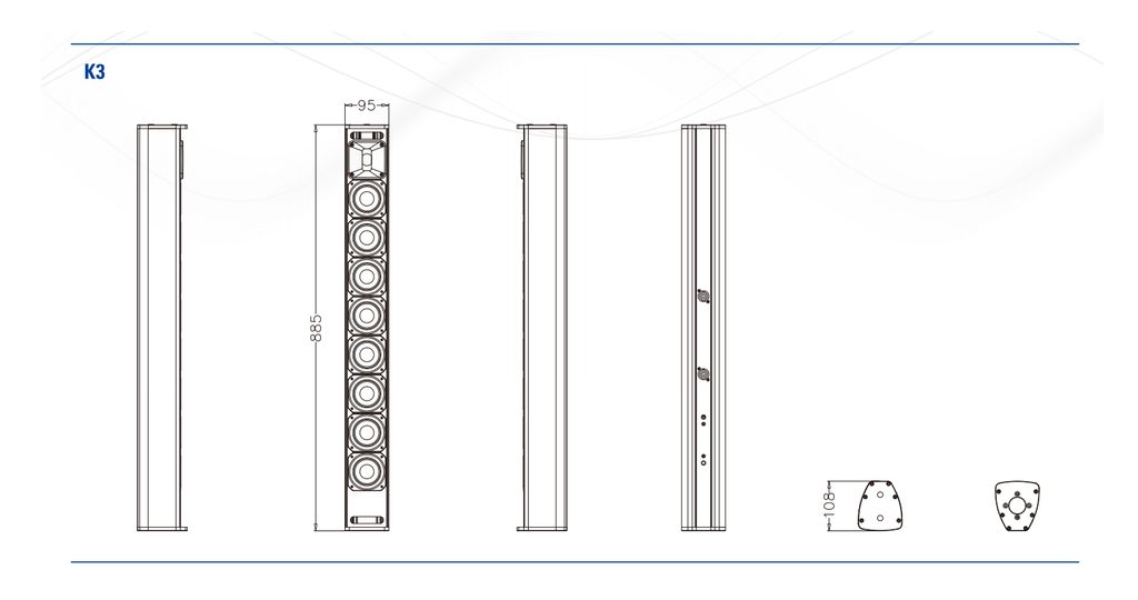 K3 – это универсальная пассивная звуковая колонна, которая может использоваться как отдельно, так и в составе комплекта с сабвуферами K12B / K12BAS. Сабвуферы K12B / K12BAS и сателлит K3 гармонично подобраны по частотам.